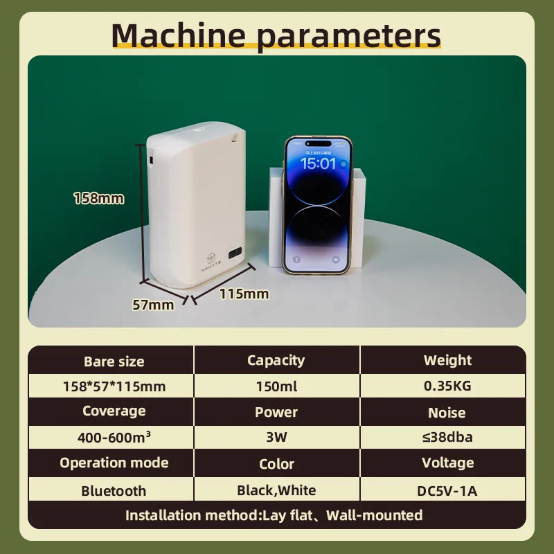 - Compact, versatile design (115 × 57 × 158 mm) with a 150 ml reservoir lets you place it on shelves, desks, or on a wall mount for steady fragrance diffusion.
